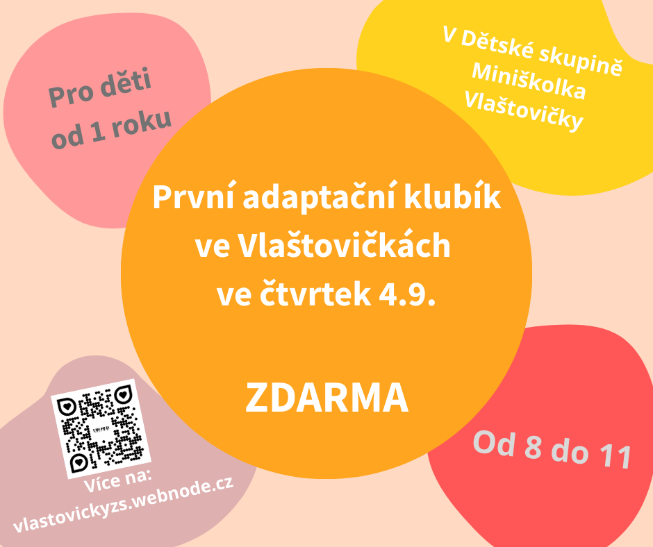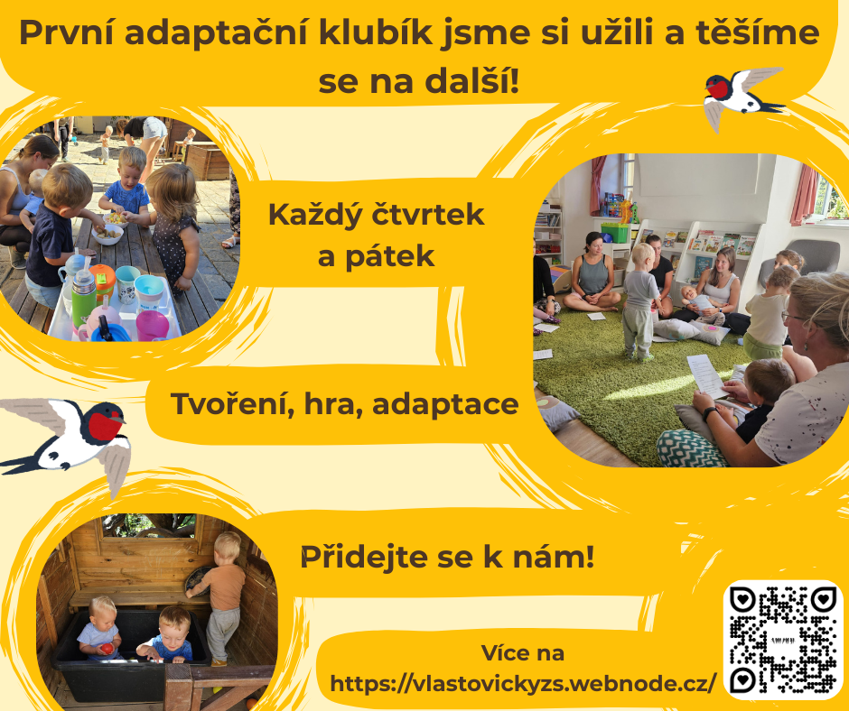 Přijďte se podívat do nového adaptačního klubíku Vlaštoviček. První setkání je zdarma. Těšíme se na Vás a Vaše děti ve čtvrtek 4.9. od 8.00 do 11.00. Odkaz na přihlašovací tabulku: https://forms.gle/svyNyXn2WTjCfhaW8